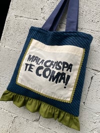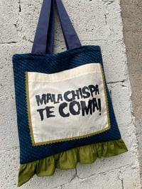 Bolsiña feita a man. MALA CHISPA TE COMA. Verde/azul. Deseño exclusivo!