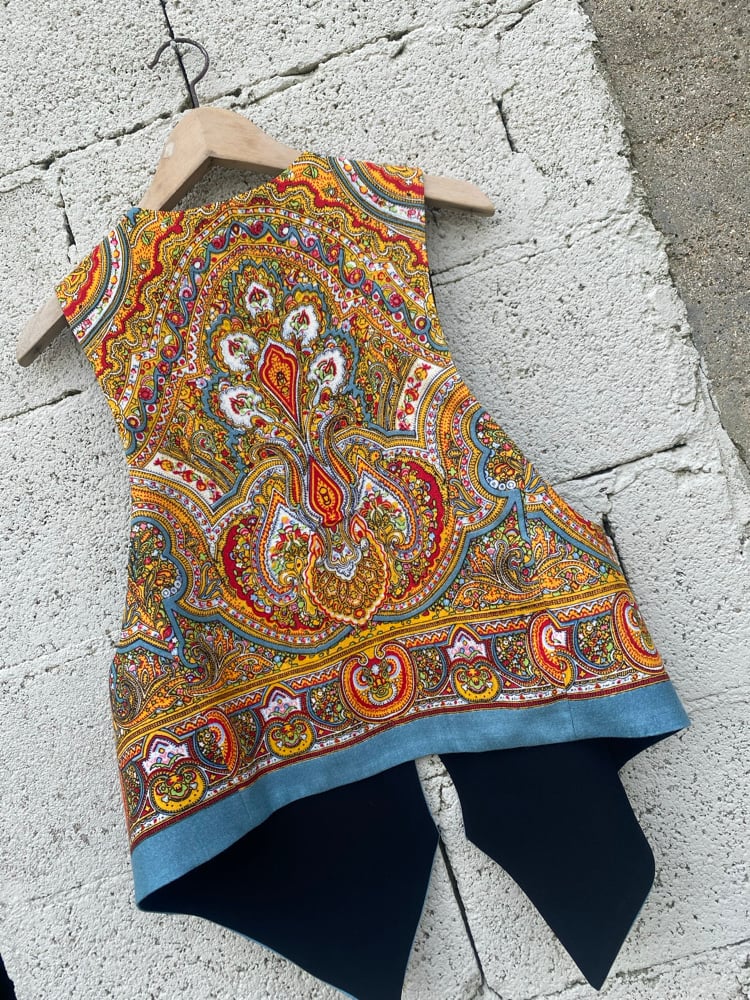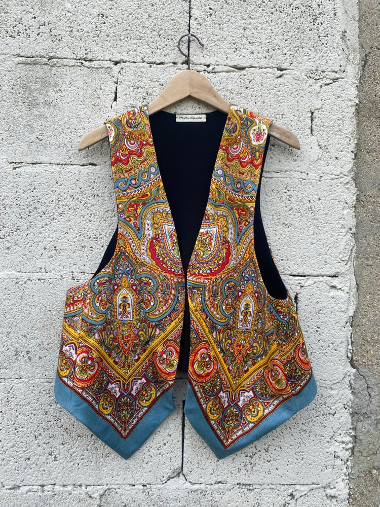 Chaleco FOLIADA. Feito a man. Feito cun pano tradicional 100cores de la. Espalda é do mesmo pano. Está forrado.