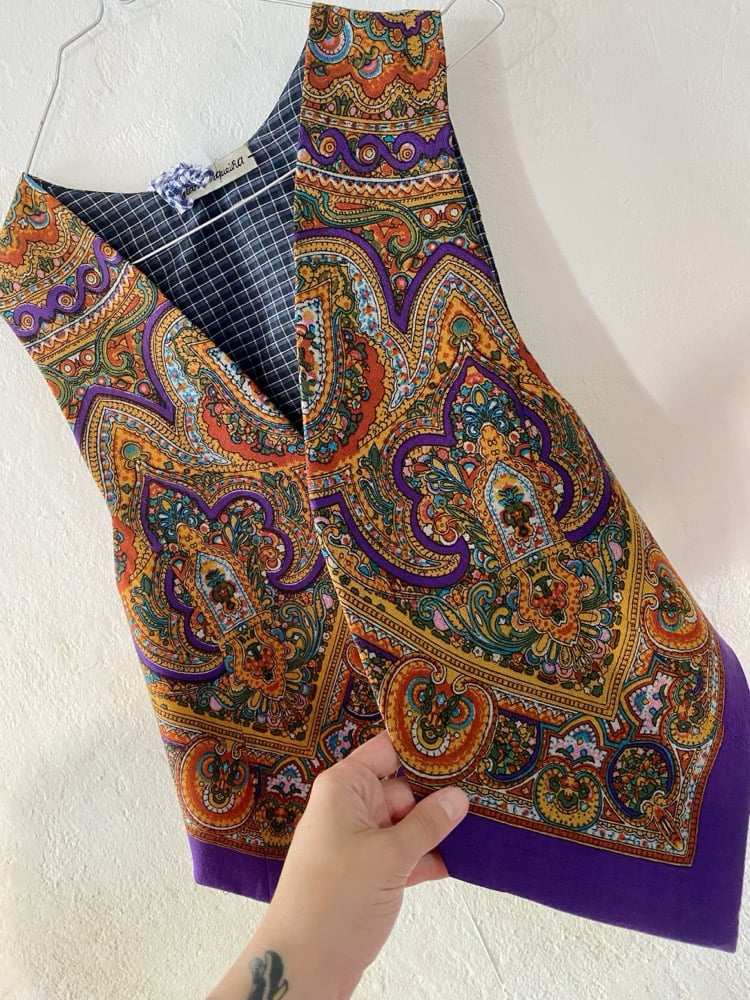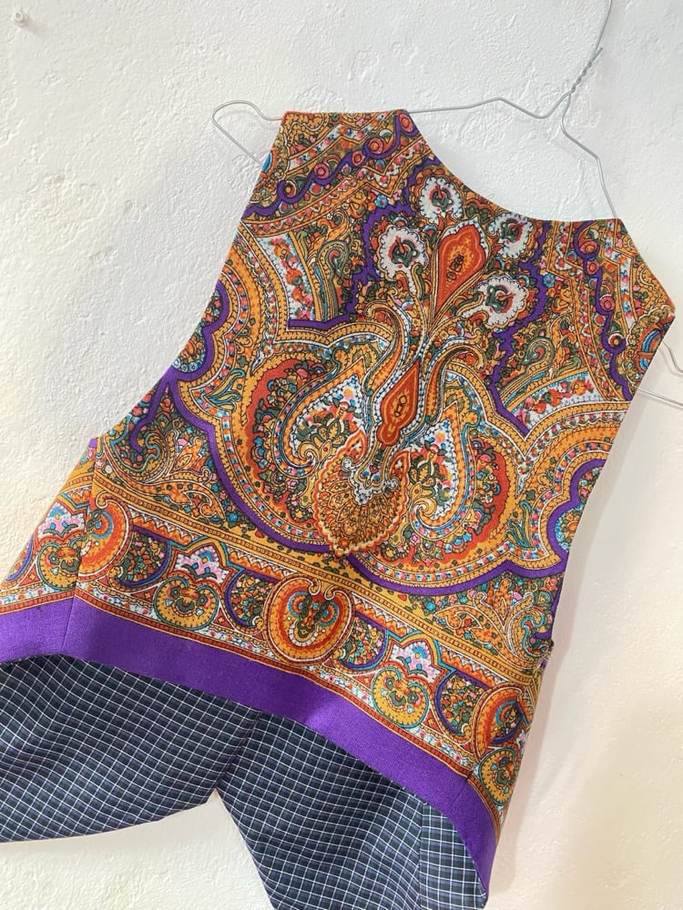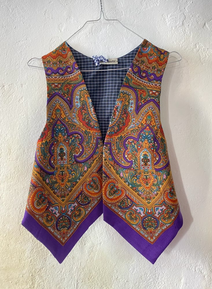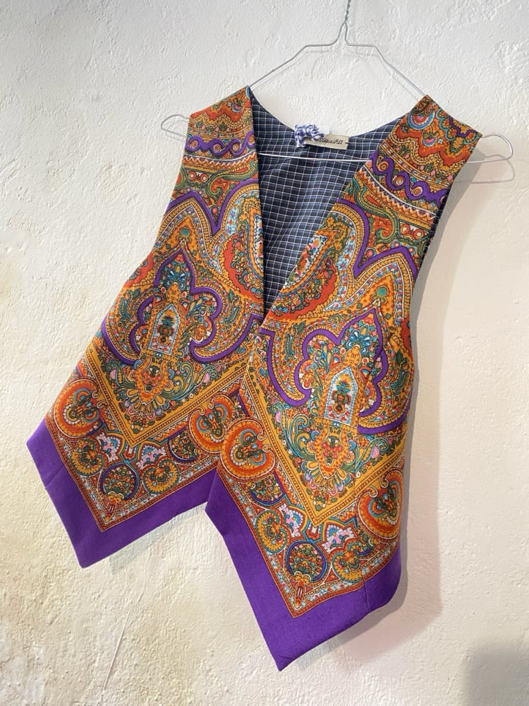 Chaleco FOLIADA. Feito con un pano tradicional de 100 cores, 100% la. A espalda é do mesmo pano. Está forrado.