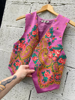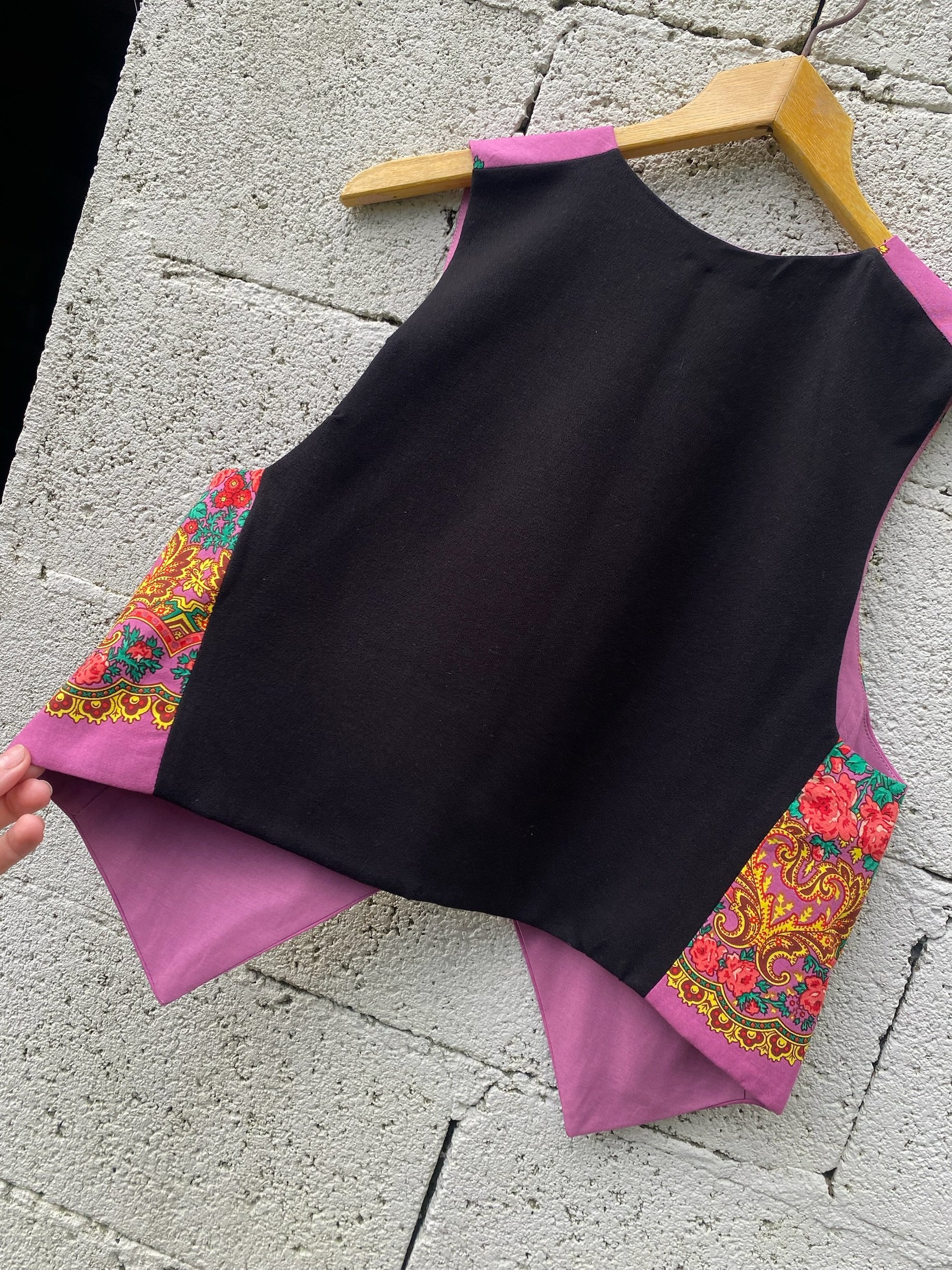 Chaleco FOLIADA. Feito con un pano tradicional. Espalda é de grepe negro. Está forrado.