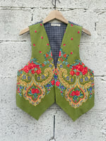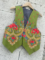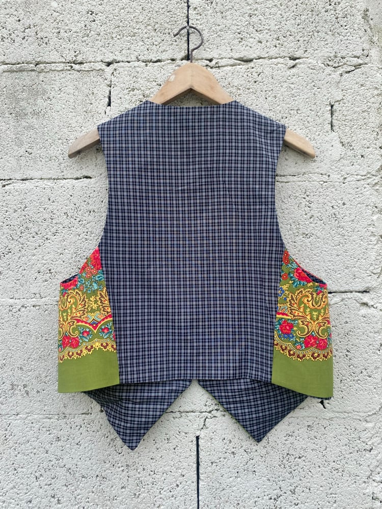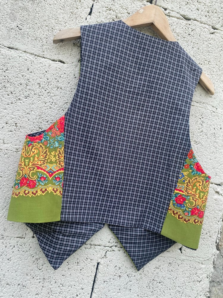 Chaleco FOLIADA. Feito a man. Feito cun pano tradicional. Espalda é de tecido cadros mandilón. Está forrado.