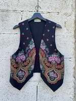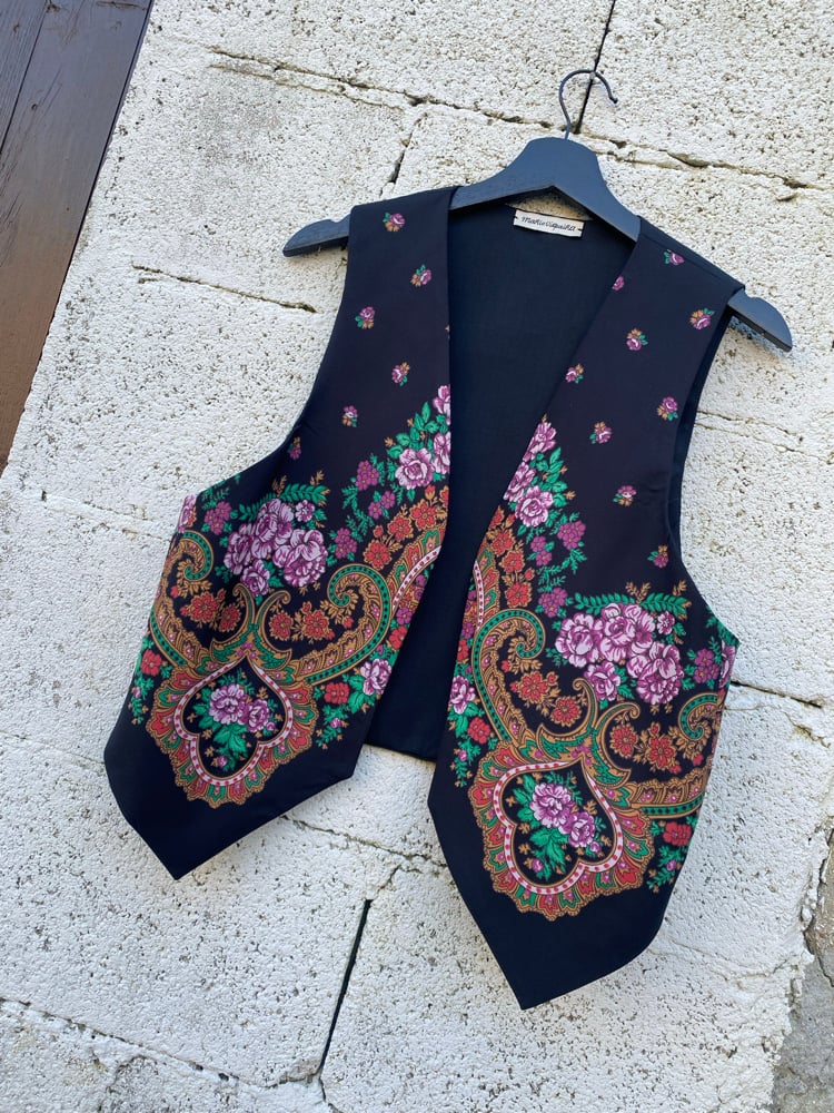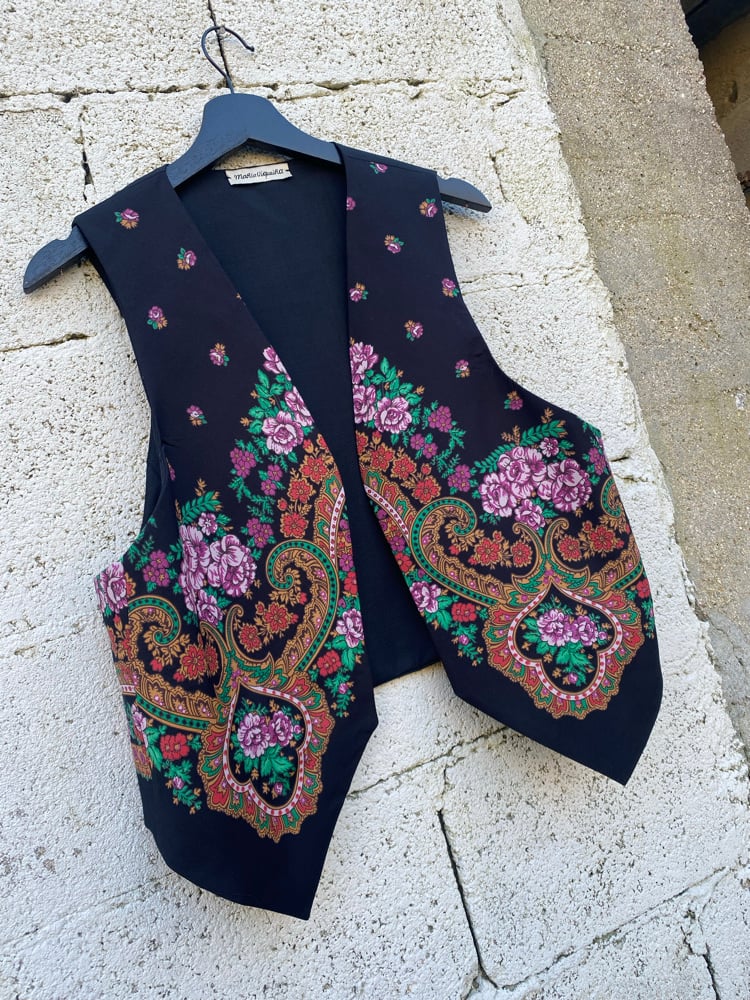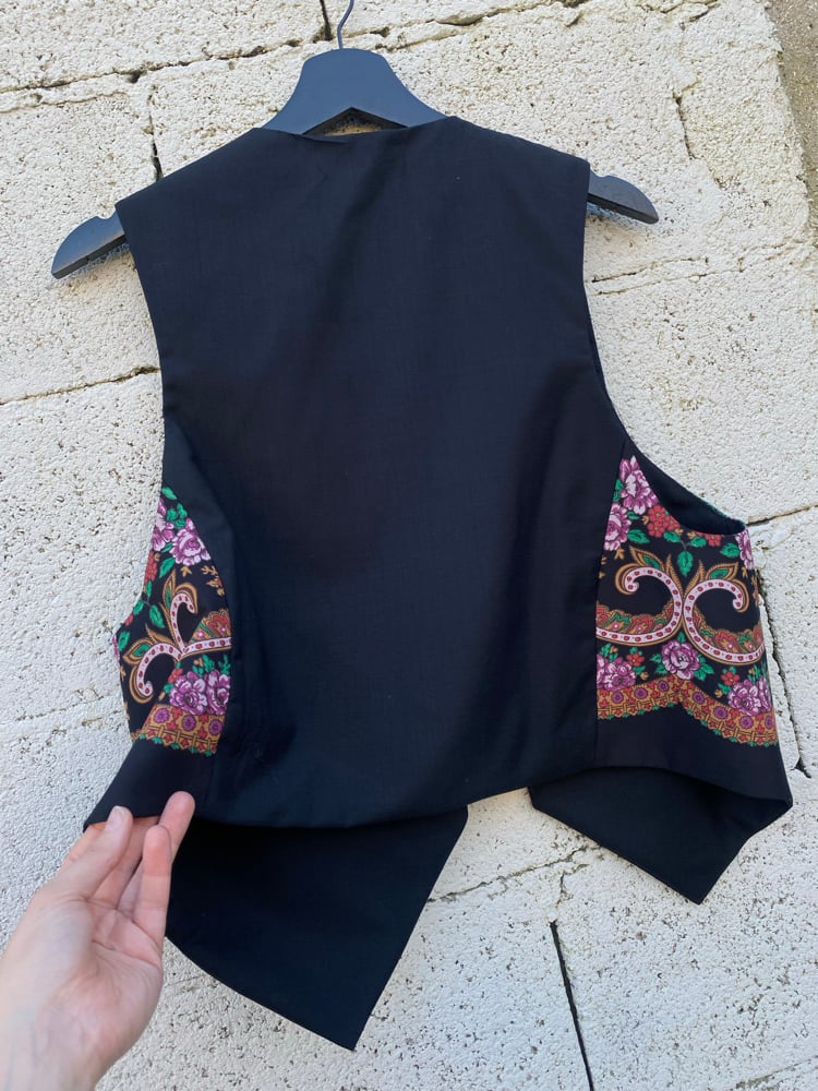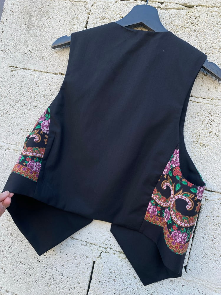 Chaleco FOLIADA. Feito a man. Feito cun pano tradicional. Espalda é de tecido de crepe negro liso. Está forrado.