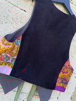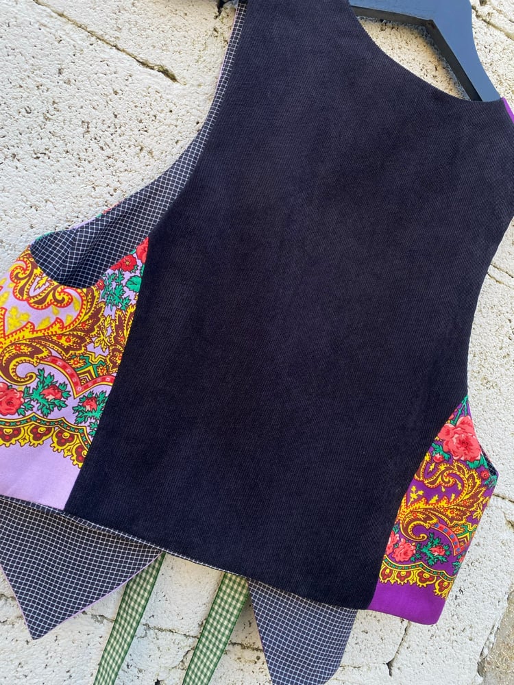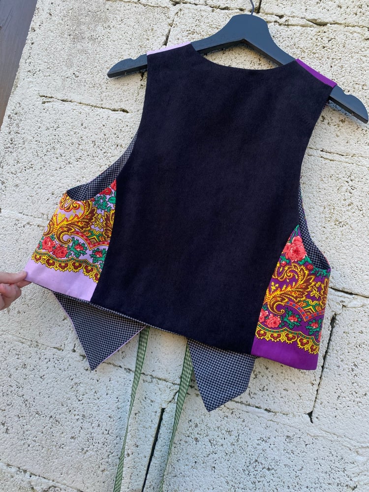 Chaleco FOLIADA. Feito a man. Feito cun pano tradicional. Espalda é de tecido de micropana de algodón. Está forrado.