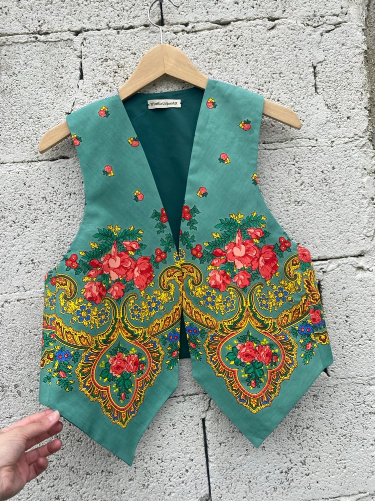 Chaleco FOLIADA. Feito a man. Feito cun pano tradicional. Espalda é de tecido de vivhy de algodon m. Está forrado.