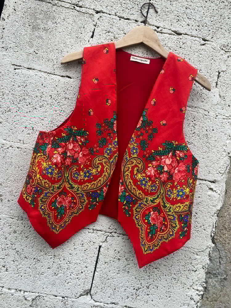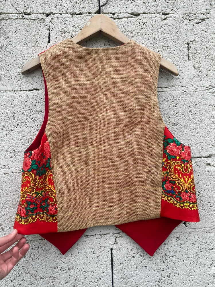 Chaleco FOLIADA. Feito a man. Feito cun pano tradicional. Espalda é de tecido crepe negro. Está forrado.