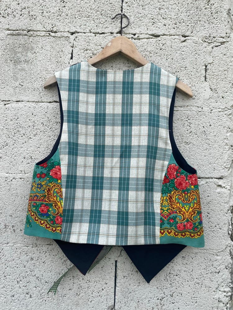 Chaleco FOLIADA. Feito a man. Feito cun pano tradicional. Espalda é de tecido de cadros. Está forrado.