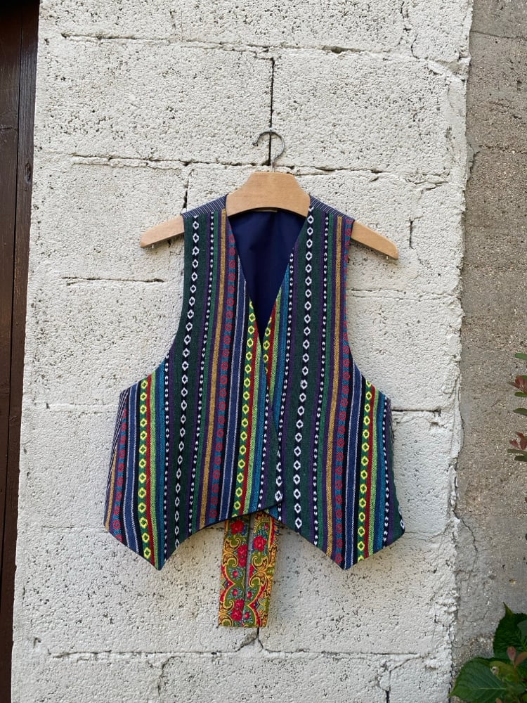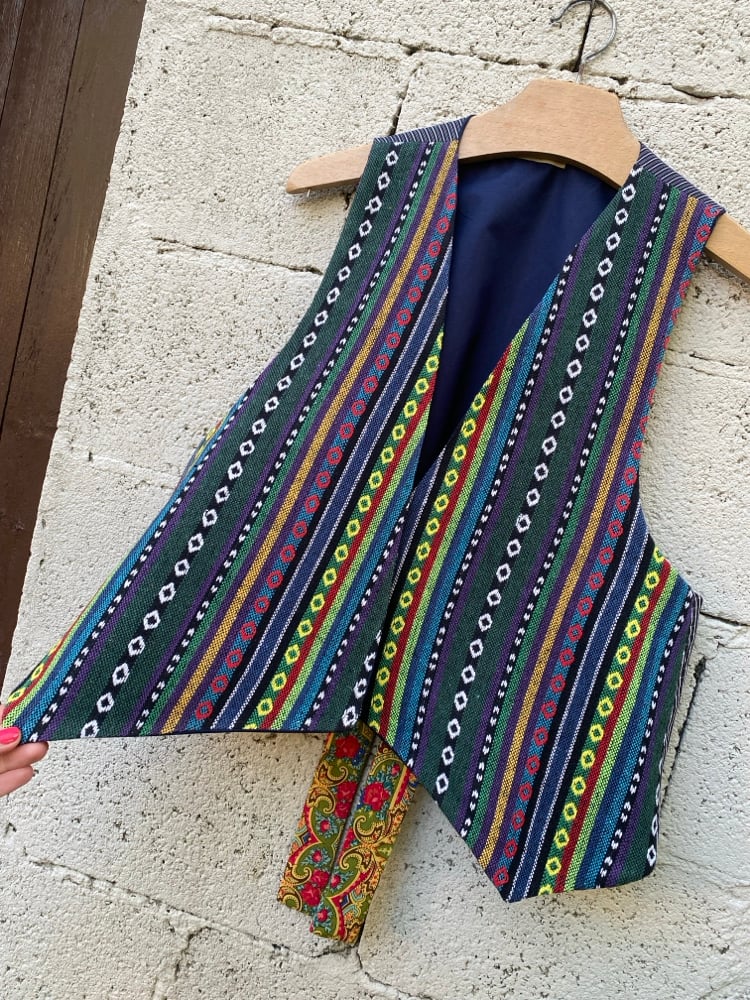 Chaleco MISTURAS. Feito con tecido tradicional alpujarreño convinado con cadros d mandilón e raias tradicionais. Está forrado.