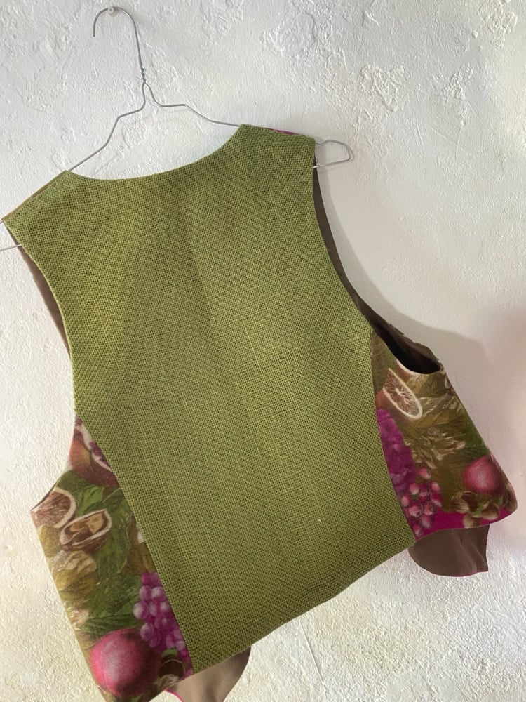 Chaleco feito a man. Feito con un pano antigo de la. A espalda é tea de saco. Está forrado.