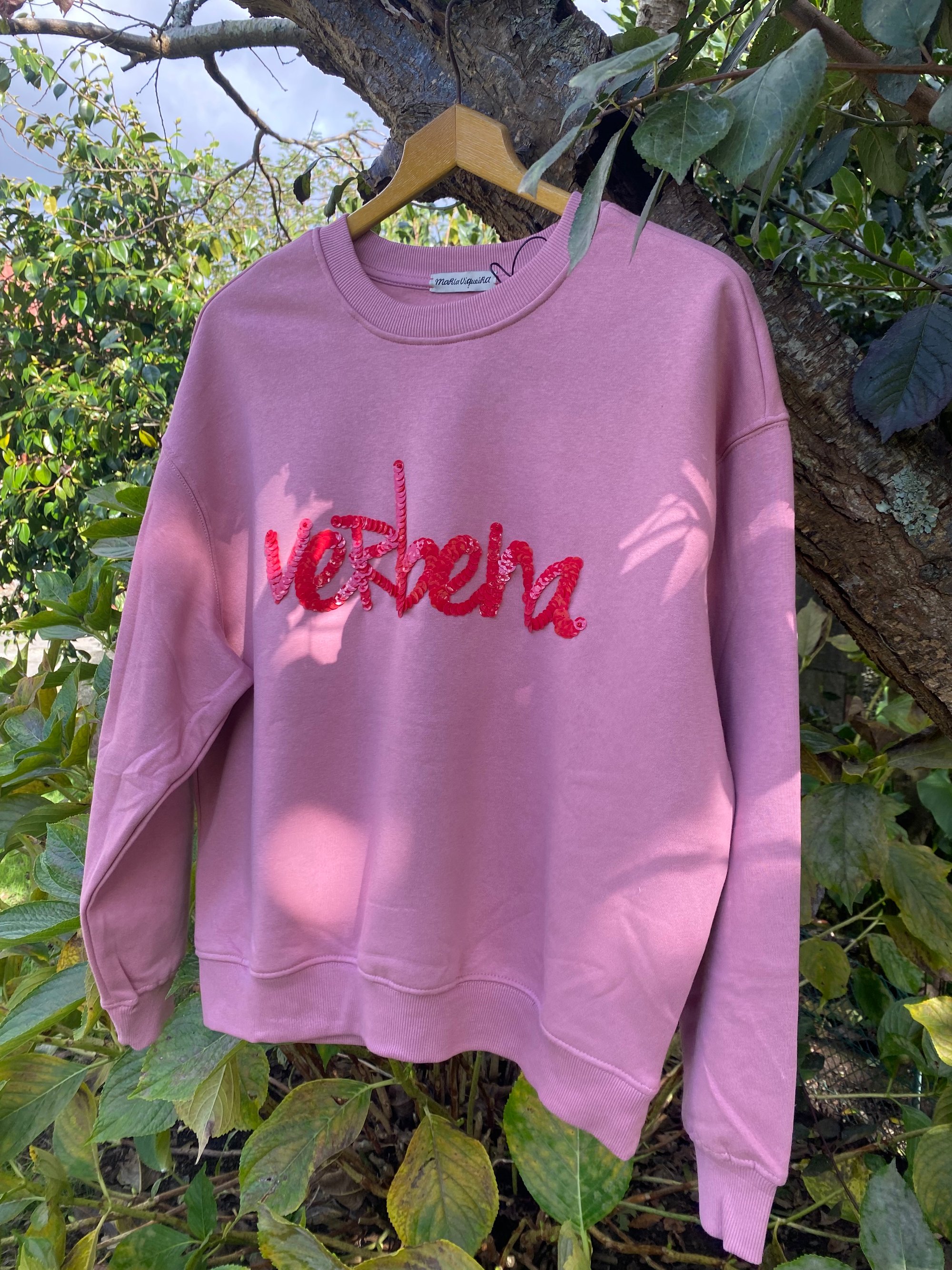 Suadoiro bordado a man. VERBENA. Rosa letras vermellas.