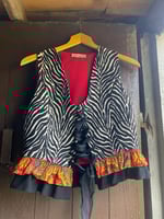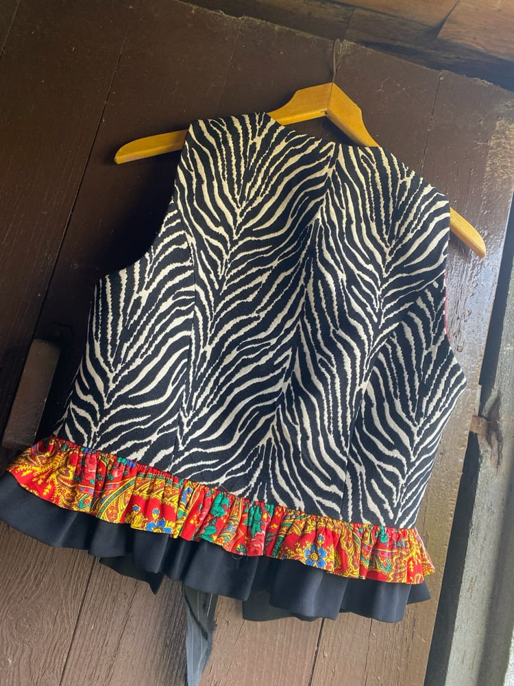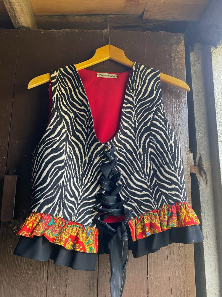 Top feito de tecido con estampado de cebra, o tecido é de gibelino. Está decirado con volantes de retais, raias e cadros de mandilón. Abrocha no dianteiro con tira entrelazada, o que fai que se poida axustar para un par de tallas.
