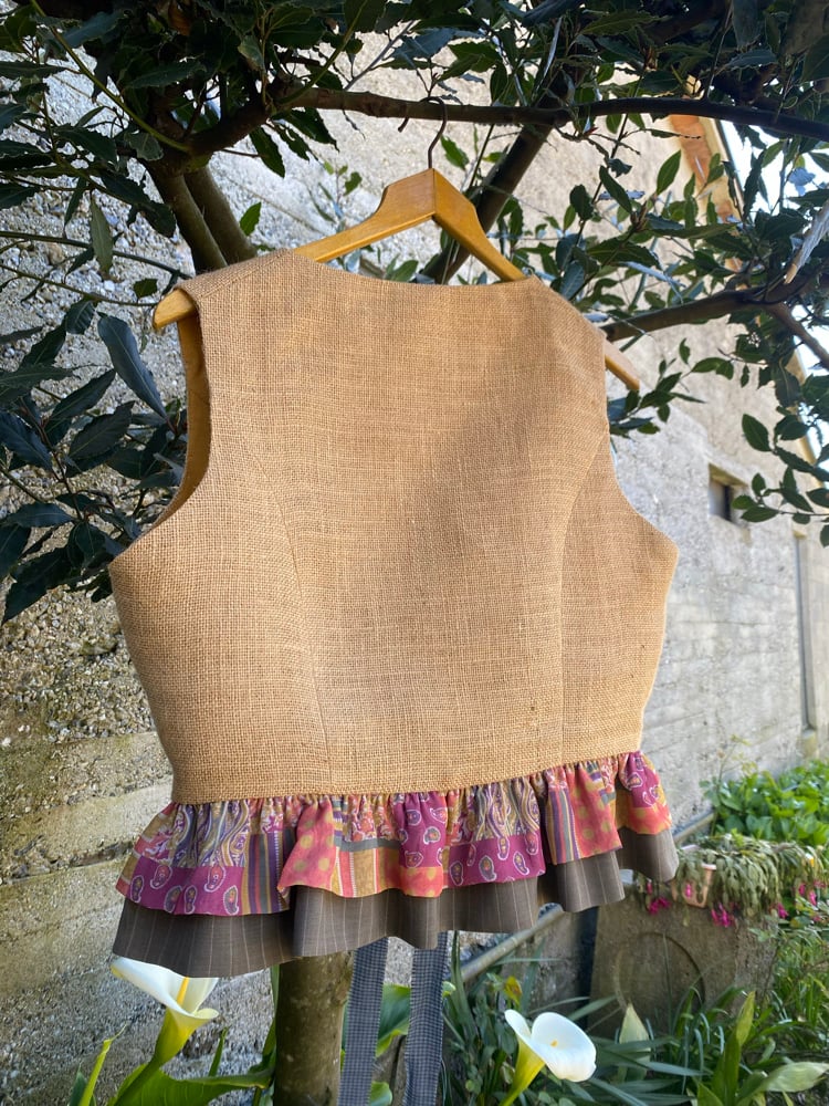 Top feito de tea de saco, decorado con volantes de retais. Abrocha no dianteiro con tira entrelazada, o que fai que se poida axustar as un par de tallas.