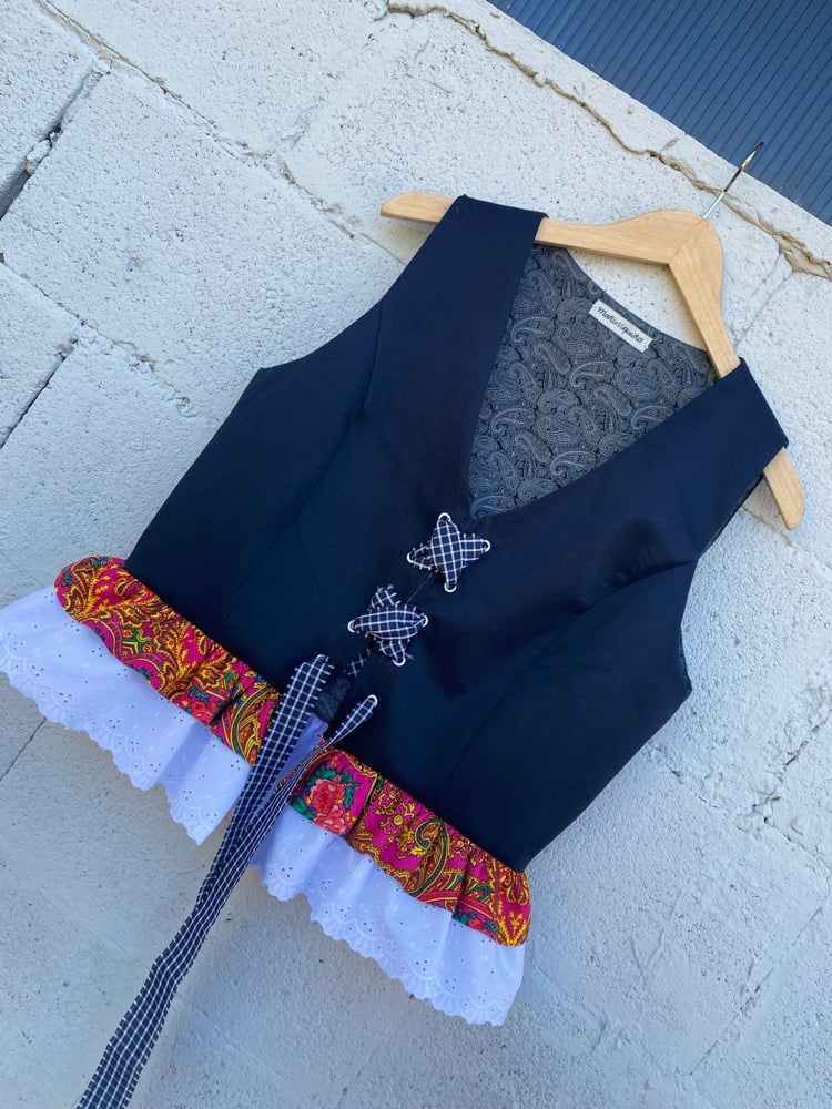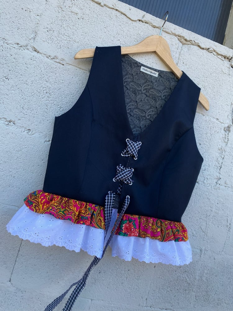 Top feito de tea principal tea gabardina negra, decorado con volantes de retais. Abrocha no dianteiro con tira entrelazada, o que fai que se poida axustar as un par de tallas.